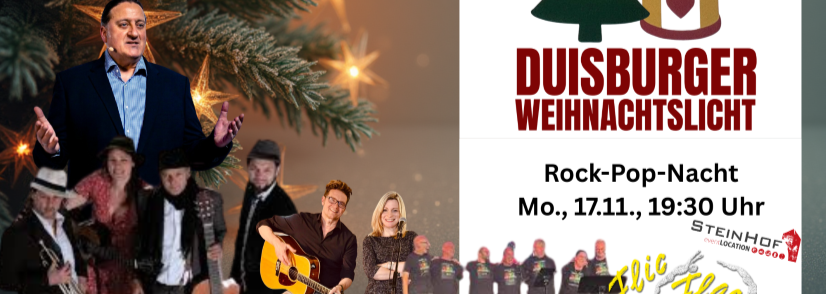 Die Auftaktveranstaltungg zum Duisburger-Weihnachtslicht, der Charity-Aktion für Duisburg! Moderiert wird der Abend von Bülent Aksen, der u.a. Mirko van Stiphaut mit Sandra, Solo zu zweit, Jenny and the Pips sowie die Happy Gangsters aus Düsseldorf erwartet.